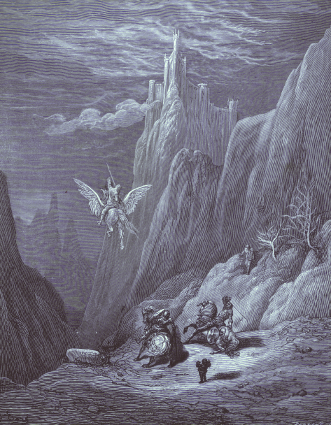 This is the enchanter, Atlante, who had raised Ruggerio from childhood, and wishes to protect him from danger and conversion to Christianity. He carries Ruggerio and the other knight back to his mountaintop castle, Bradamante following as best she can on foot. He comes out to oppose her, trying to stun her with his shield. She pretends to be uncoscious, and he lands and dismounts. She captures him and forces him to free his prisoners. He escapes, taking his castle with him, but Ruggerio and all the prisoners are now free. Ruggerio, however, climbs on the hippogriff, and it flys off with him, leaving a desperate Bradamante behind. Before it touches earth again, the hipporiff flys entirely around the world, landing in England. Ruggerio ties it to a myrtle tree, and it tears at the branches and .