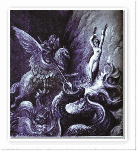 Two warriors are fighting over Angelica at the foot of the impossibly huge tree, while she is visible as a white blotch fleeing on horseback. Angelica seems always to be escaping from one or another infatuated, would-be lover. After several such escapes Angelica is taken under the wing of a kind hermit, who turns out to be an evil magician. He transports her to the coast of Ireland, and while she is unconscious attempts to rape her. The aged magician, however, cannot get it up, and at last goes off and leaves her. She is captured by the natives who have offended the sea god, Proteus, and have to sacrifice a beautiful maiden periodically to a sea monster called the "orc." Angelica is chained to the rock and left for the dragon, another version of the Perseus and Andromeda story, and the later St. George and the princess of Egypt story.
