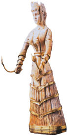 The connection of the snake with both knowledge and rebirth is, or will be discussed elsewhere on this site, so I will pass over that matter. But let us return to the riddle of the magic cow that represents a mulberry tree. There is another answer that comes as easily to mind, and seems less absurd and improbable--the moon. Traditional moon colors are white, red, and black, and considering the central place of cattle in Cretan religion, it would seem only natural to identify the horned cow with the horned moon. The moon, too, is central to Cretan religion, as it generally is in religions which place a great deal of stress on the female and on fertility. The mulberry tree is a goddess symbol, not only because of its moon-colored fruit, but perhaps also because of the worms that eat its leaves, enshroud themselves, and are reborn as moths. The horned cow is also her symbol, as it is of Hera in Greece, and this particular cow is doubly so, since it daily undergoes the moon's sequence of Colors. The connection between the moon and vegetable nature is well known--planting and harvesting by the moon is still widely practiced, even in America. Fertility religions are religions of rebirth. The serpent is both symbol of rebirth, and an animal sacred too and closely identified with the Earth Mother.