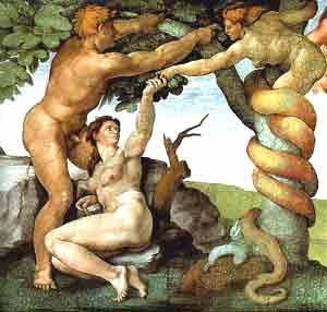 Graves' use of this theory is sometimes questionable. At times the evidence is slight. He also implies that the secondary stories, if that is the proper term for them, have no significance. Thus to Graves, the pervasive and archetypal story of Andromeda is little more than a misrepresentation. However, Graves' approach can be useful, even if there is no evidence of iconographic misrepresentation. Approach a myth as a painter would; try to catch the one scene in which all or most of the elements can be caught together, and the essentials suddenly become clear. Approach the story of Eve this way. If you do, you will see the scene so often presented by painters, Michelangelo, Raphael, and others--tree, serpent girldled; woman holding an apple; man. Woman, tree, and serpent appear as a unit; the man stands a little apart. This picture could as easily be Perseus receiving the apples of the Hesperides, and any ancient Greek or Roman would have assumed that it was either that, or Hercules in a similar quest.
