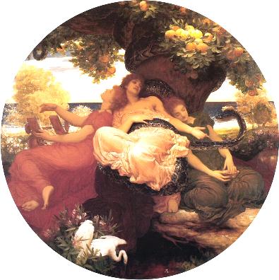 16.See Lord Leighton's painting, "Garden of the Hesperides" on this site. The three maidens are lying at the foot of the apple-laden tree with the watchful serpent coiled about both them and the tree.