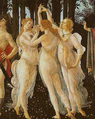 21.Raphael portrays the three graces each holding an apple, thus showing their essential oneness with the Hesperides. Botticelli, with comparable insight, places the graces in the company of the vegetation goddess Flora in his "Primavera." Paintings are often a better source for understanding myth than written works, for of all the arts, literature is the most intellectual and abstract, and therefore the most removed from primative patterns of thought.