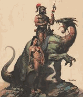 This is Boris' cover picture for Nomads of Gor. It was not the first or only cover for this book, but is certainly the best. This is not the original frame; I added this to color-coordinate it with the rest of the page. There are no horses on Gor. Most of the animal life seems more or less reptilian, though some of it is evolved in a mammal-like way. The large beast is a tharlarion, the standard mount for warriors.