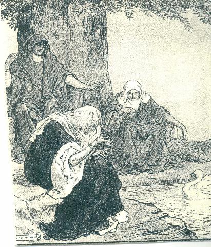 Picture of the Norns, Norse/ Germanic goddesses of fate, by C.E. Brock, a very busy early 20th century artist, best known for his illustrations of the Jane Austin books.