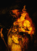 Below are two more pictures. Neither is full-face, but the one on the left by Burne-Jones gives a sense of the power, mystery, and depth of Odin. The one on the right seems to me very expressive. Neither Odin nor Frigga looks especially young or attractive, but this scene of parting before battle, perhaps Ragnarok, shows the emotions of strong people It would be hard to imagine a convincing version of this involving Zeus and Hera.