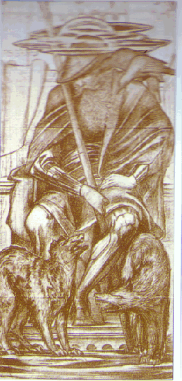 Edward Burne-Jones' interpretation of Odin with his wolves and ravens. His spear, another Odin icon, is resting against his body. The ravens, Hugin and Munin (thought and memory), appear to be carrying out their function of reporting back to him all that is happening in the nine worlds.