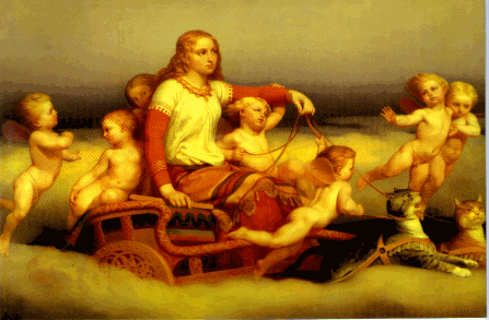 The picture above represents Freya in her cat-drwn chariot. The face seems to me overly soft and classical, and the cupids deinitely belong to a different traditon, but it does get the point across. Freya is a goddess of love, lust, and sex. She is also a goddess of magic, and she shares with Odin the slain in battle. She is a more hot tempered and assertive goddess than one might gather from this picture.