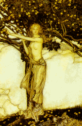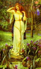 I am very fond of this cute little goddess, but she is not really Freya; this is one of Arthur Rackham's illustrations for Wagner's Ring Cycle, in which Wagner combines her with Iduna, and makes her a demure 19th century woman. The picture below is less memorable, but is a little closer, though Freya is usually pictured as blonde and blue eyed. Here Freya beside a flower-girt stream is admiring the Brisingamen, the fabulous necklace she got from the four dwarves who made it by agreeing to sleep a night with each of them. Freya is the sister of Frey and one of the three Vanir hostages among the Aesir. She is a goddess of beauty, love, sex, and fertility. She is also a goddess of magic, and is said to have taught Odin the art of seithr. She is also a battle goddess, and claims half the slain, though whether the first half is hers or Odin's is not clear. To find her equivalent among the Greeks one would have to combine Aphrodite with Athena, though she is neither as vindictive, nor as abstractly intellectual as Athena. One might compare her to the Sumerian Inanna, but ultimately she is Freya, not like anyone else, and certainly not some generalized archetype of female nature to be thrown into a grab bag of goddess, most known only by their names, as so many non-Asatru pagans are wont to do. Her husband's name is Od, and we know little about him, though one of the eddaic poems gives him a grand list of ancient ancestors. Their affectionate relationship ended when Od left her over her various love affairs, but not before she produced two daughters, Gersemi and Hnoss.