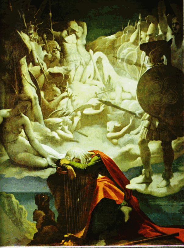Ossian, by Ingres. Ossian is a long, heroic poem supposedly from the northern heroic age, and translated from ancient manuscripts by James Macpherson. The work, actually a forgery, as Samuel Johnson and several others maintained from the first, fired the imagination of a whole generation including such men as Jefferson, Napoleon, and Goethe. The sleeping poet with the phantoms of warriors and beauties surrounding his head seems to me a fine representative of the creative artist.