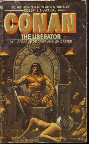 This cover for this 1979 edition looks rather like Boris' work, but it is actually Ken Kelly, who also did the Terillian picture for Sharon Green's The Warrior Within. It is clear from this picture that Conan is a bigger than life figure. He thoroughly dominates the scene, in spite of four attractive girls as nearly nude as a book cover can get away with. The framing chair and the uncompromising frontal nature of the pose suggests an icon, or perhaps Ingres' icon-like pictures of Napolean and Zeus. Notice, by the way, that this particular book is one of the many Conan books written since Howard's death.