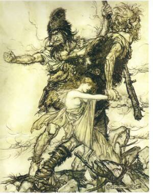 The picture above is not from any actual Norse story, but from Richard Wagner's set of operas, The Ring of the Niblungs. The 19th century seemed to have been particularly fond of the archetype of beautiful woman as victim, something we will hear much more about later. Thus he makes his version of Freya far more timid and demure than the forceful goddess of Norse tradition. There is not a single story or episonde from actual Northern tradition in which Freya is a victim. The fact that she can absolutely refuse marriage to a Giant even at the cost of great danger to the gods says much about the status of women in Northern pre-Christian society.